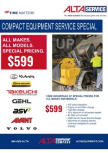 Alta Equipment is offing an all makes & models compact construction equipment service special. Alta Equipment is equipped to provide unparalleled service for your construction equipment needs.